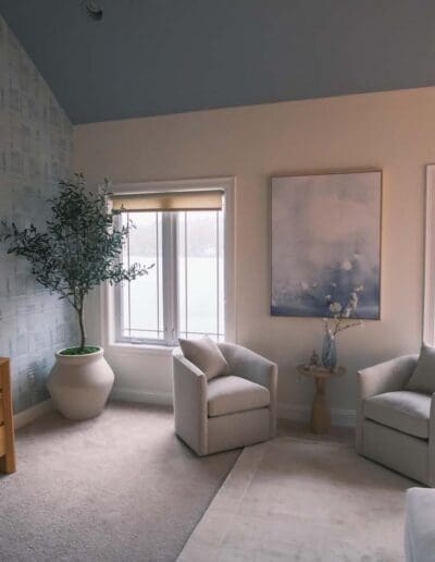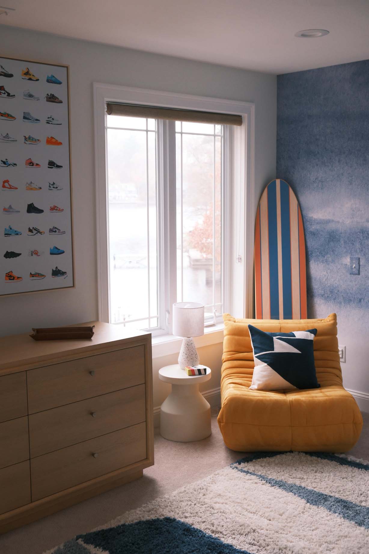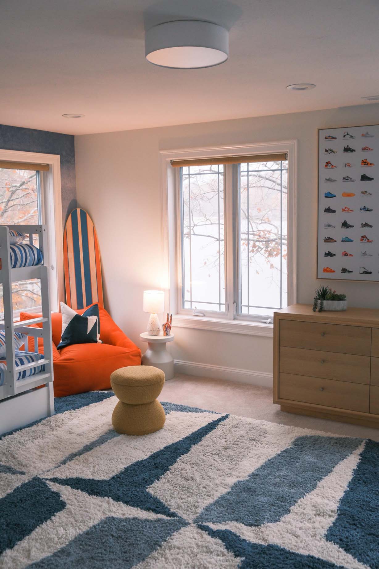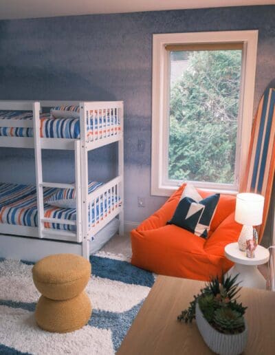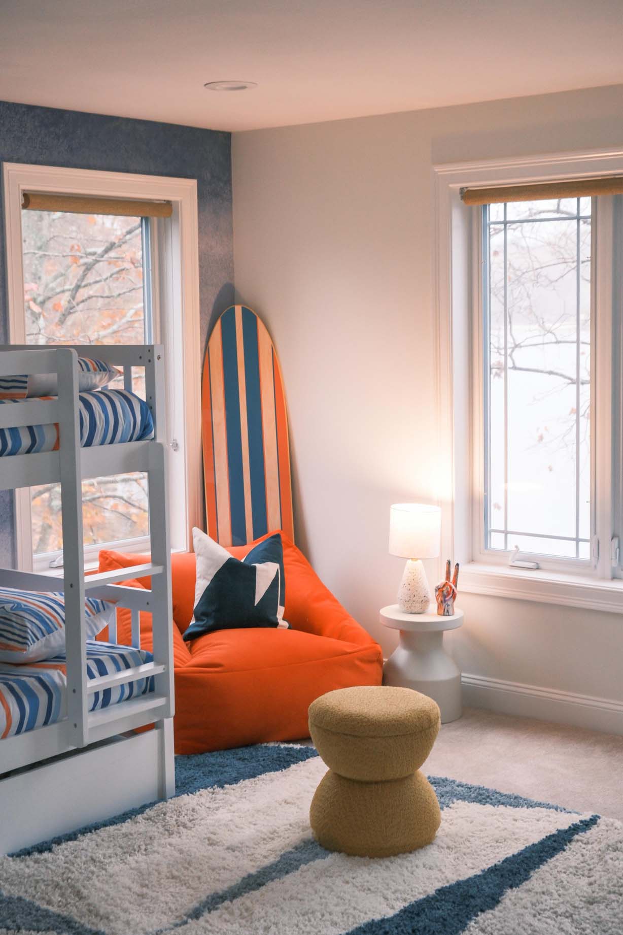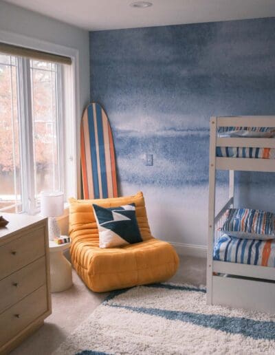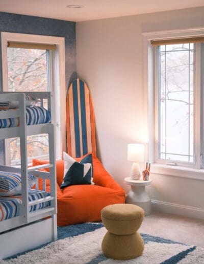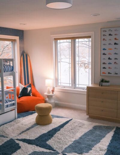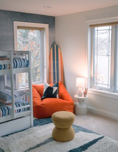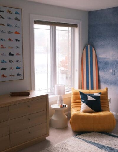 Once weighed down by dark walls and heavy curtains, this Windham kids’ room is now bursting with color, comfort, and creativity. A bold accent wall, lively carpet, and soft, plush furnishings create a playful atmosphere perfect for sleepovers and hangouts.