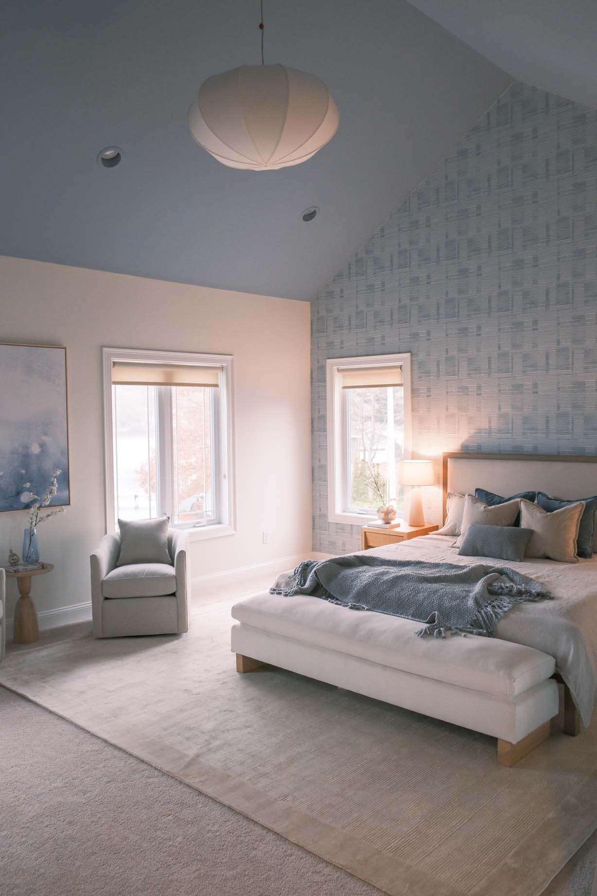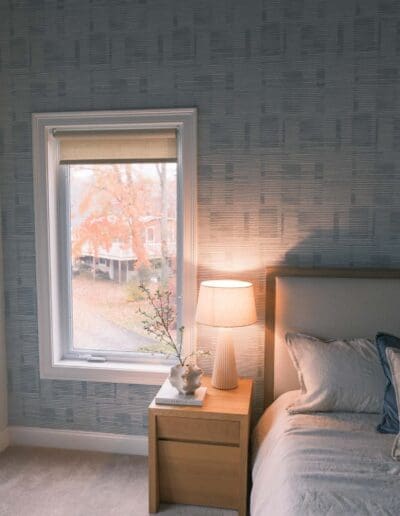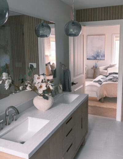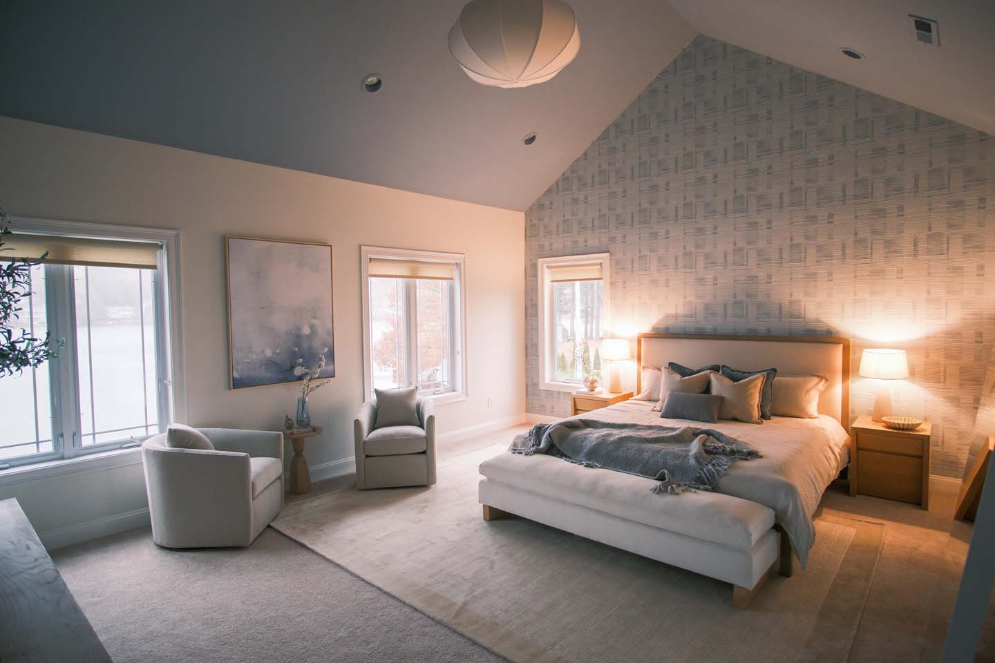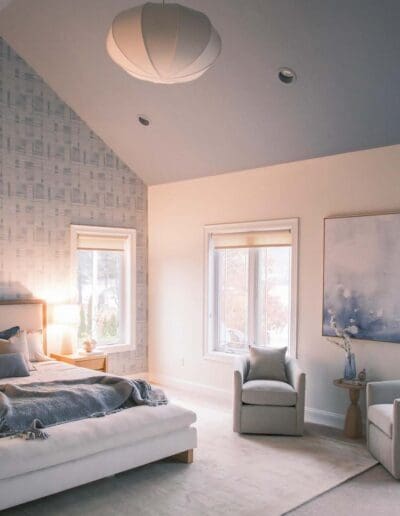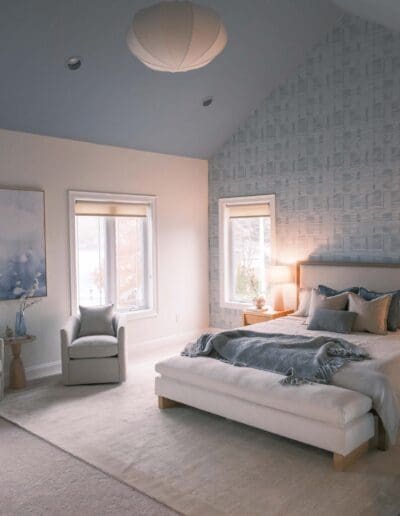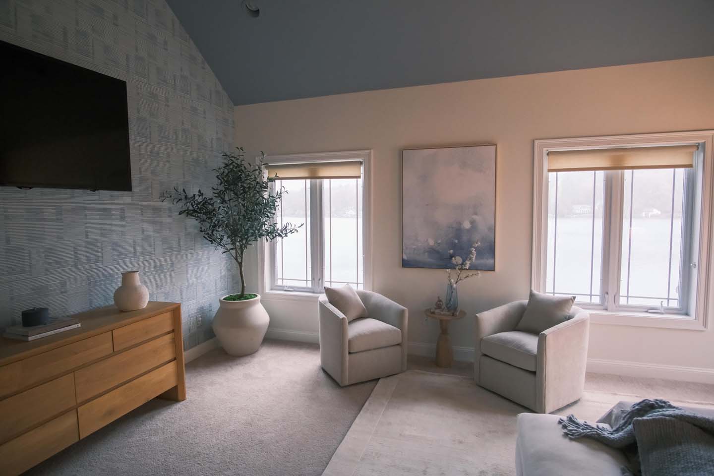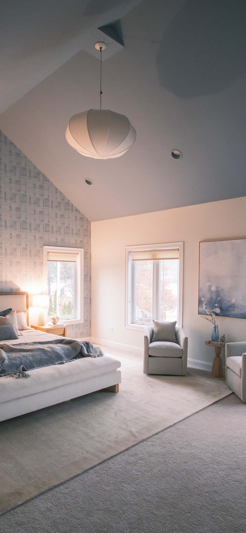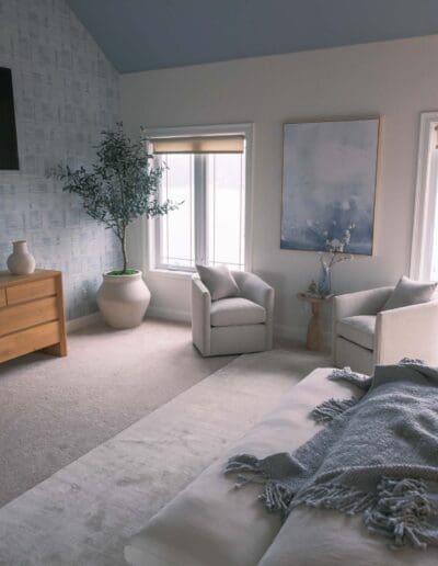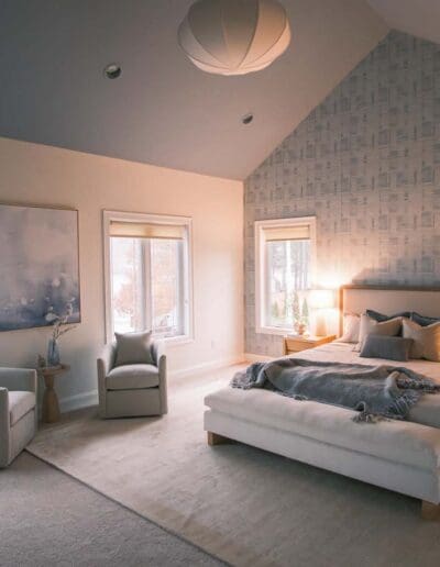 This Windham master suite was transformed into a calming retreat that blends comfort, warmth, and spa-inspired luxury. The bedroom now features soft neutrals, layered textures, and a statement accent wall that brings subtle dimension to the vaulted space. Just steps away, the master bathroom underwent a full refresh—swapping its dated finishes for modern tilework, a freestanding tub, and a bright, open shower. Together, the redesigned spaces create a serene sanctuary perfect for unwinding at the end of each day.