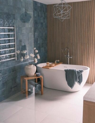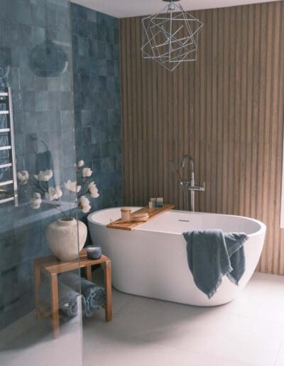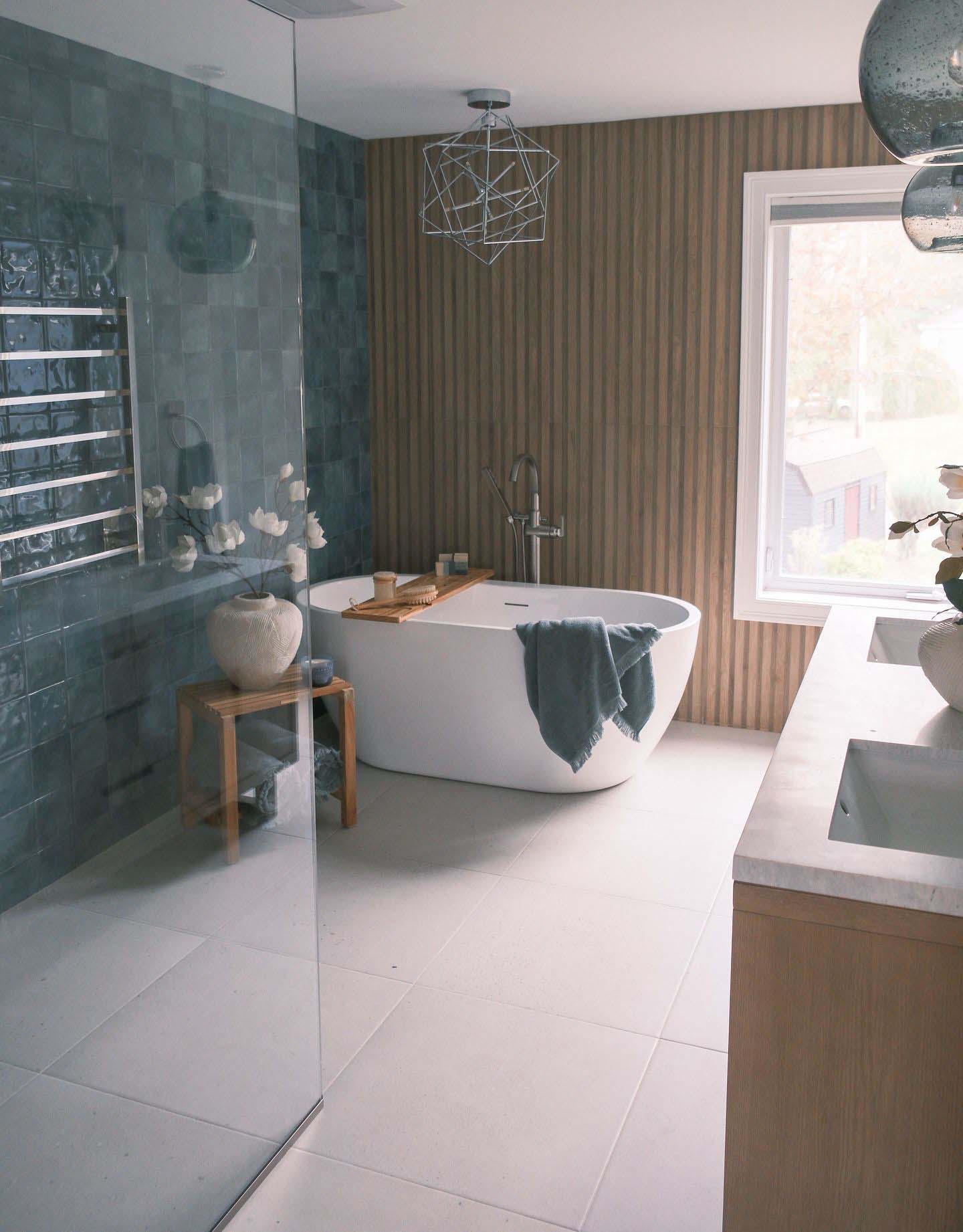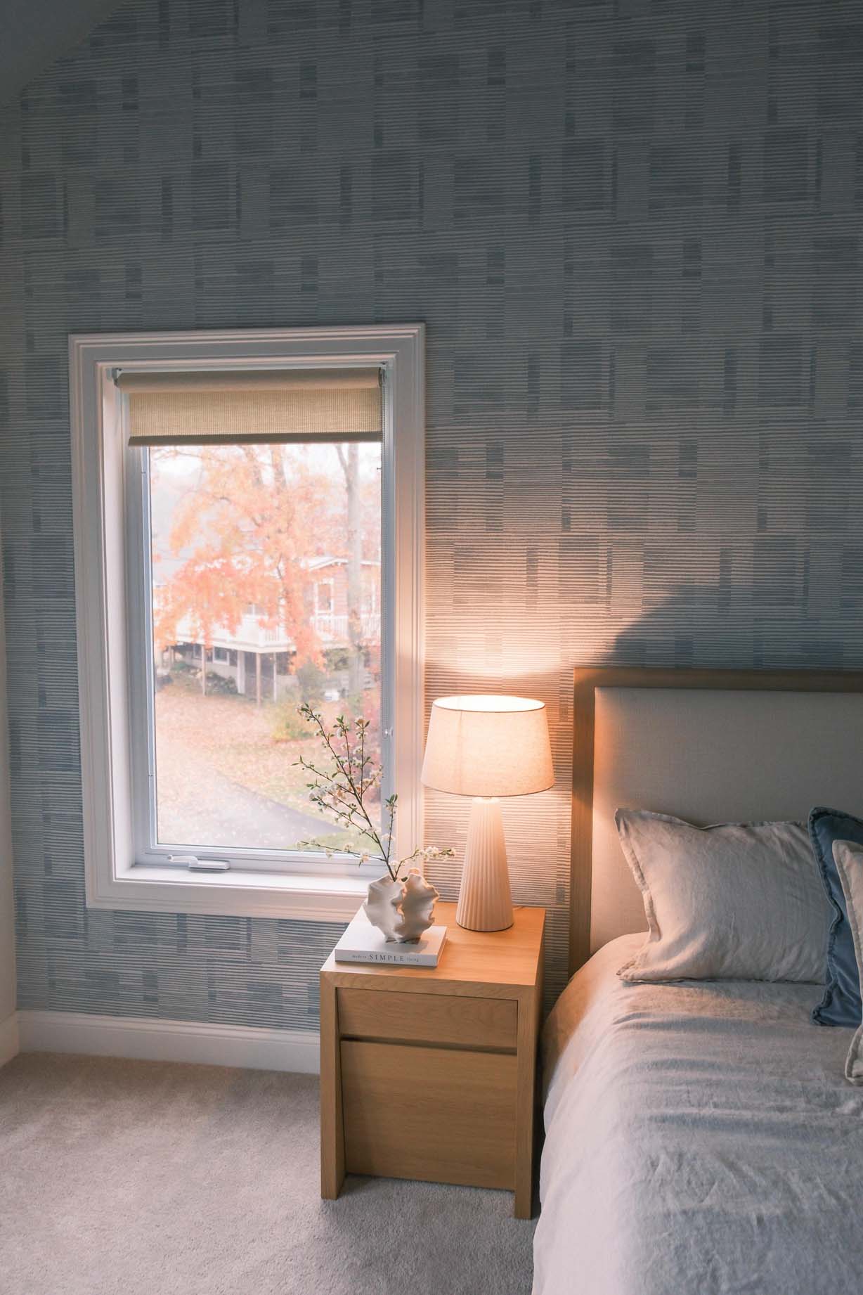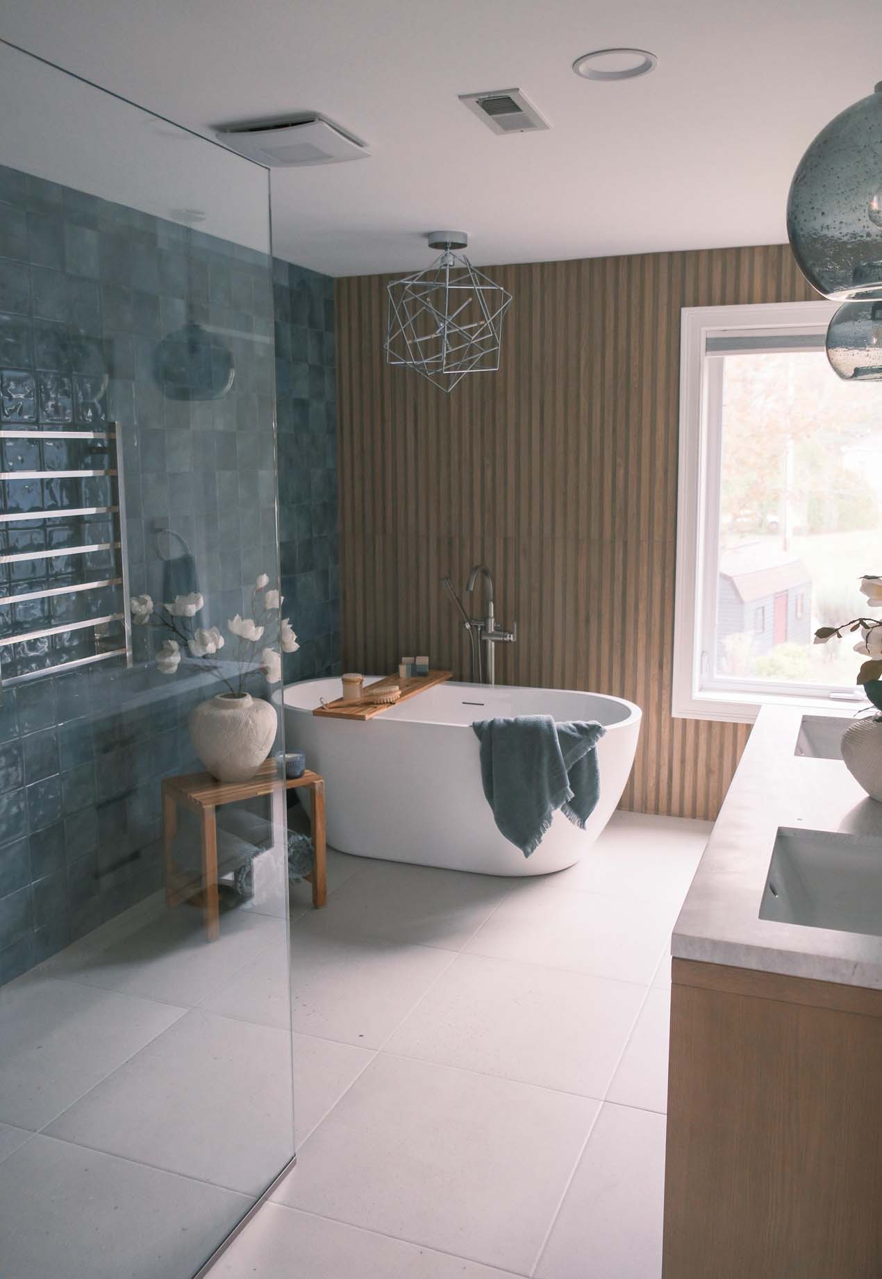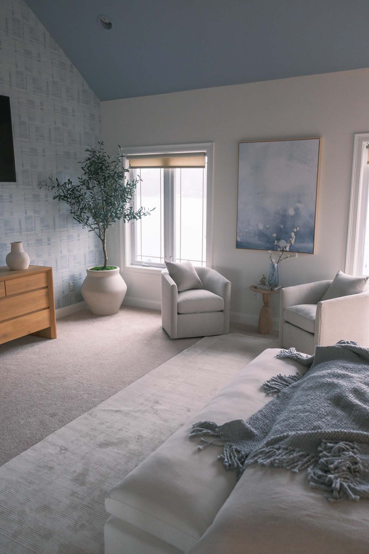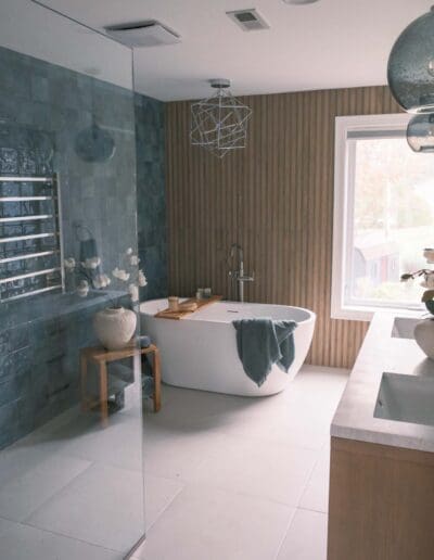 This Windham master suite was transformed into a calming retreat that blends comfort, warmth, and spa-inspired luxury. The bedroom now features soft neutrals, layered textures, and a statement accent wall that brings subtle dimension to the vaulted space. Just steps away, the master bathroom underwent a full refresh—swapping its dated finishes for modern tilework, a freestanding tub, and a bright, open shower. Together, the redesigned spaces create a serene sanctuary perfect for unwinding at the end of each day.