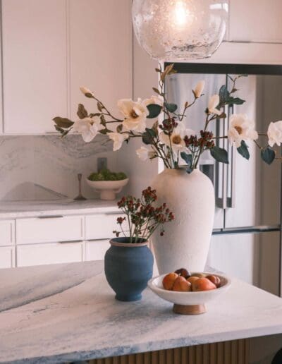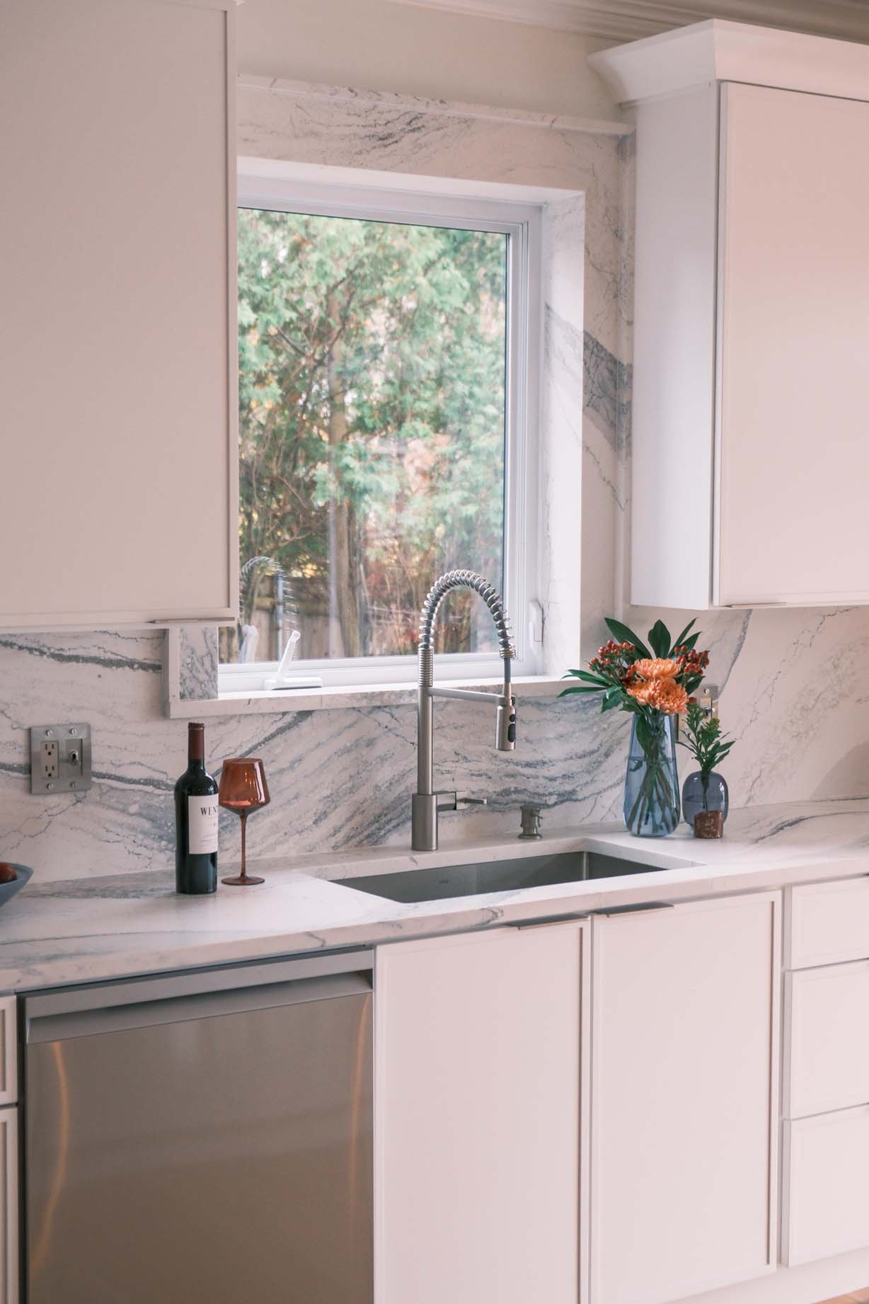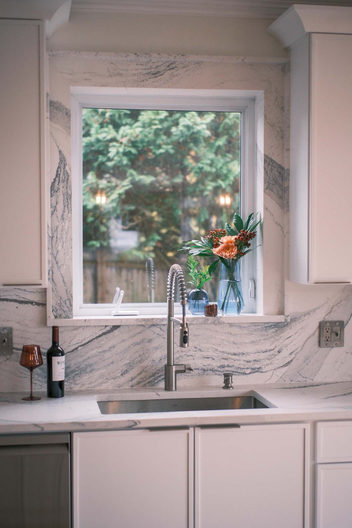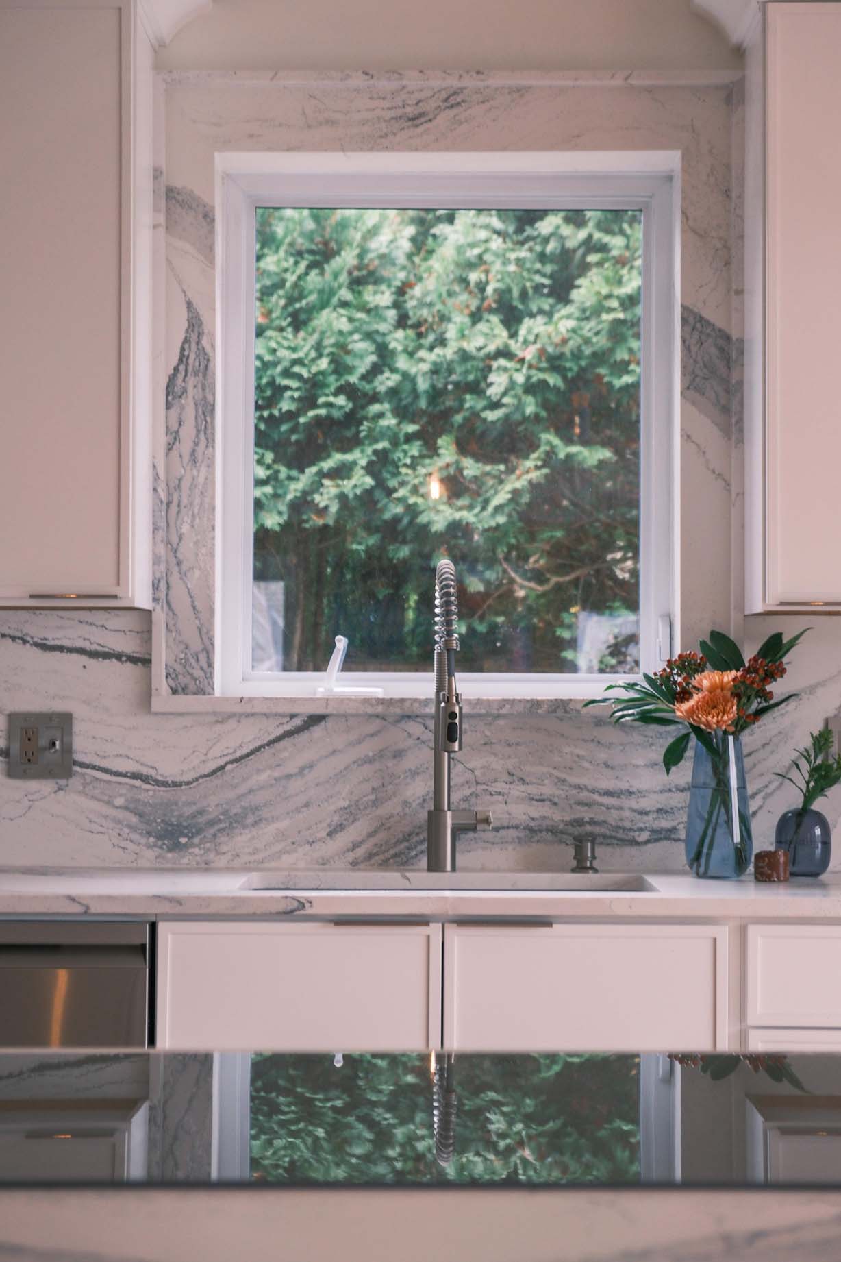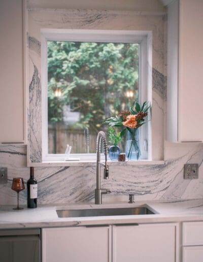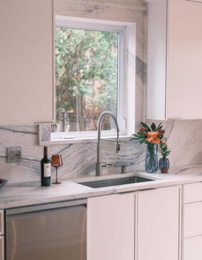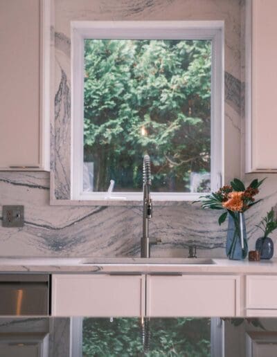 What was once an outdated kitchen is now a bright, contemporary centerpiece featuring striking marble veining, minimalist cabinetry, and refined finishes. The new layout enhances natural light, while upgraded fixtures and a sculptural island elevate the entire space. This transformation brings modern luxury and effortless livability to the home.