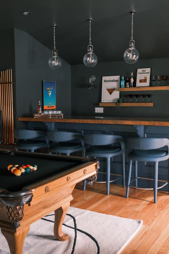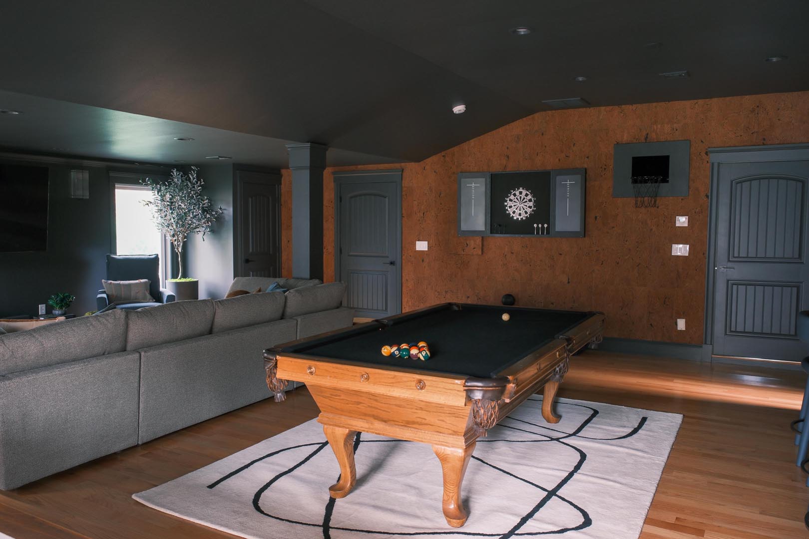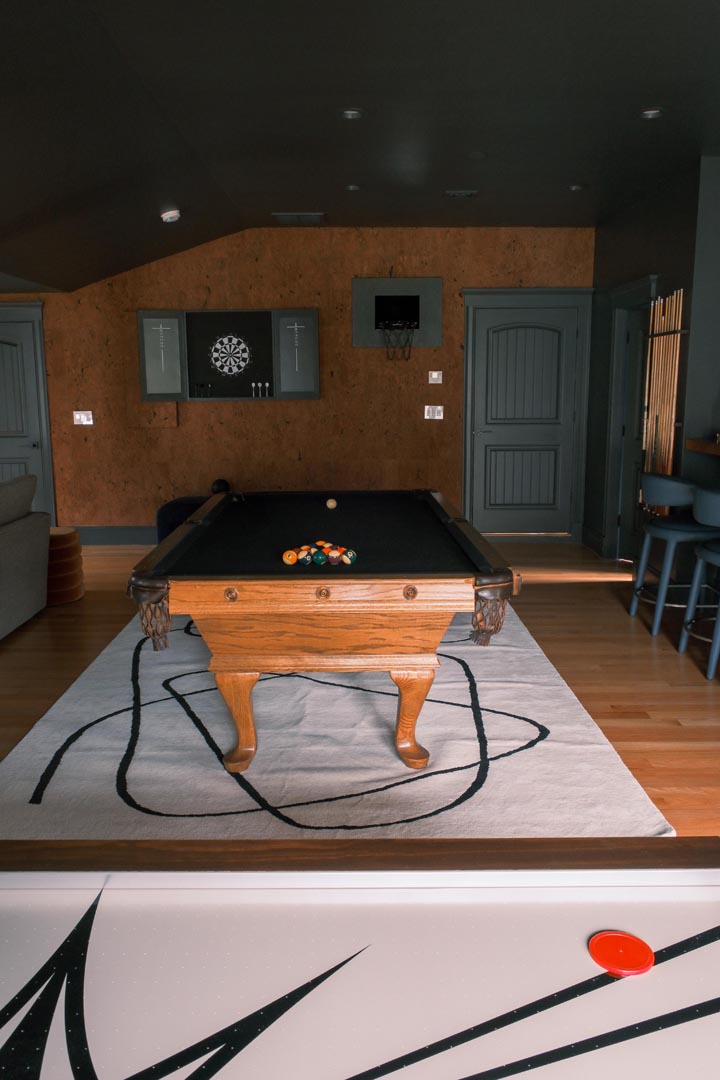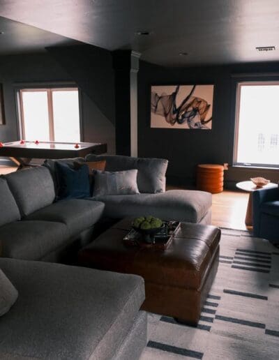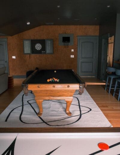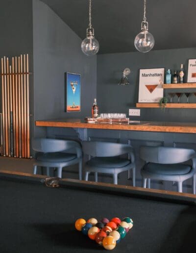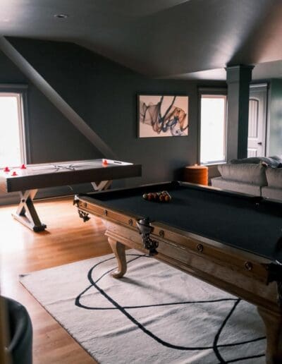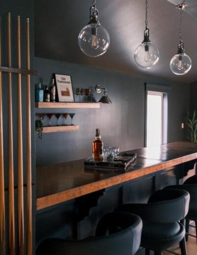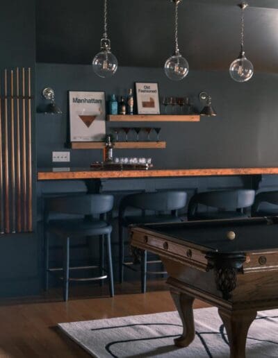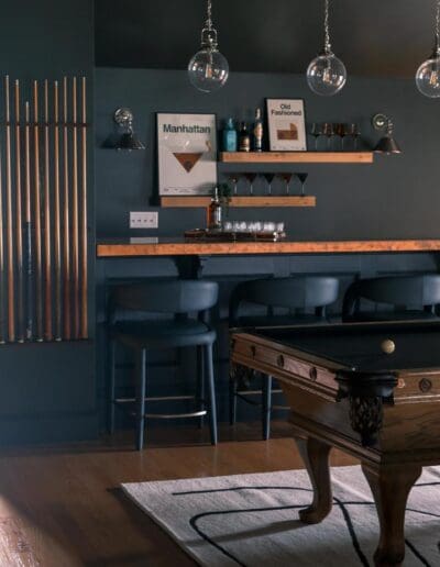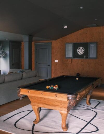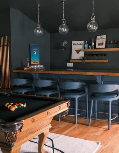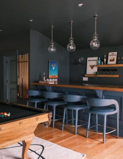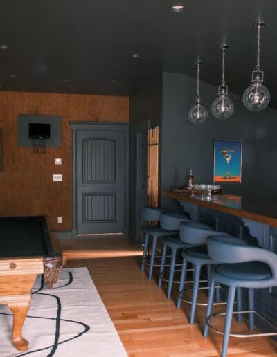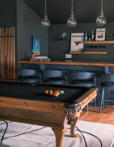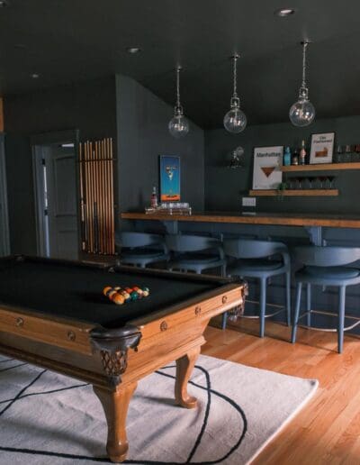 This family home in Windham, NH transformed from a simple, rustic bar setup into a modern game room designed for all ages. With moody gray tones, chrome accents, and a custom bar, the space now feels sleek, refined, and inviting. Featuring a pool table, TV, and cork dart wall, it’s the perfect spot for entertaining and relaxing together.
