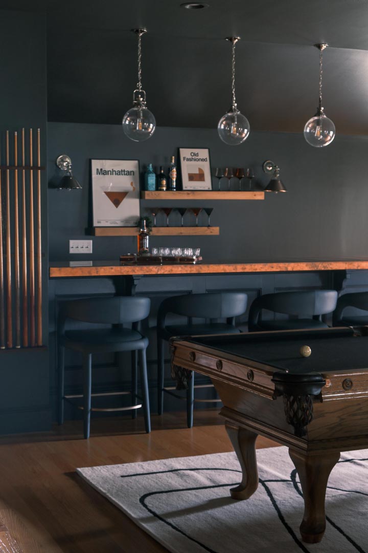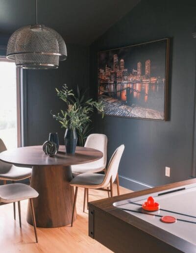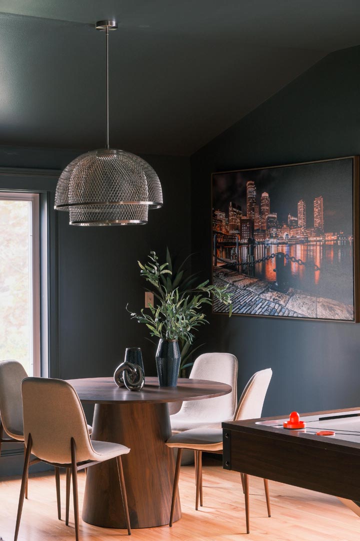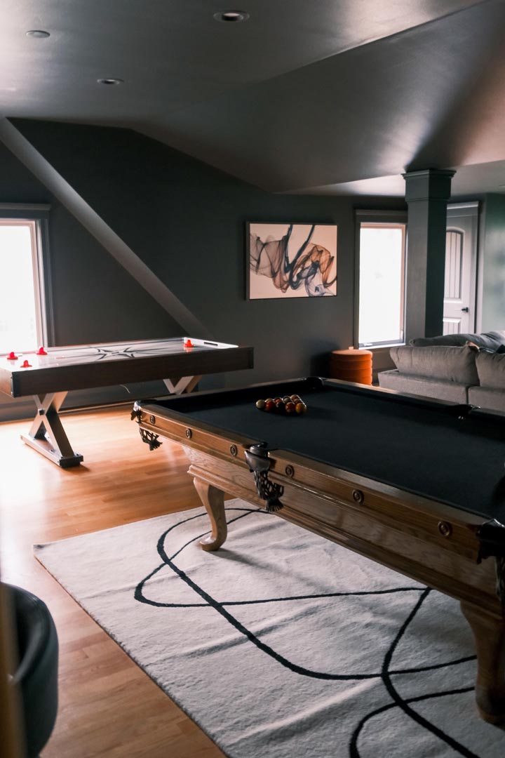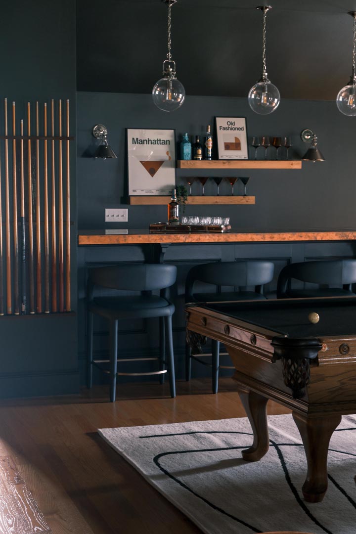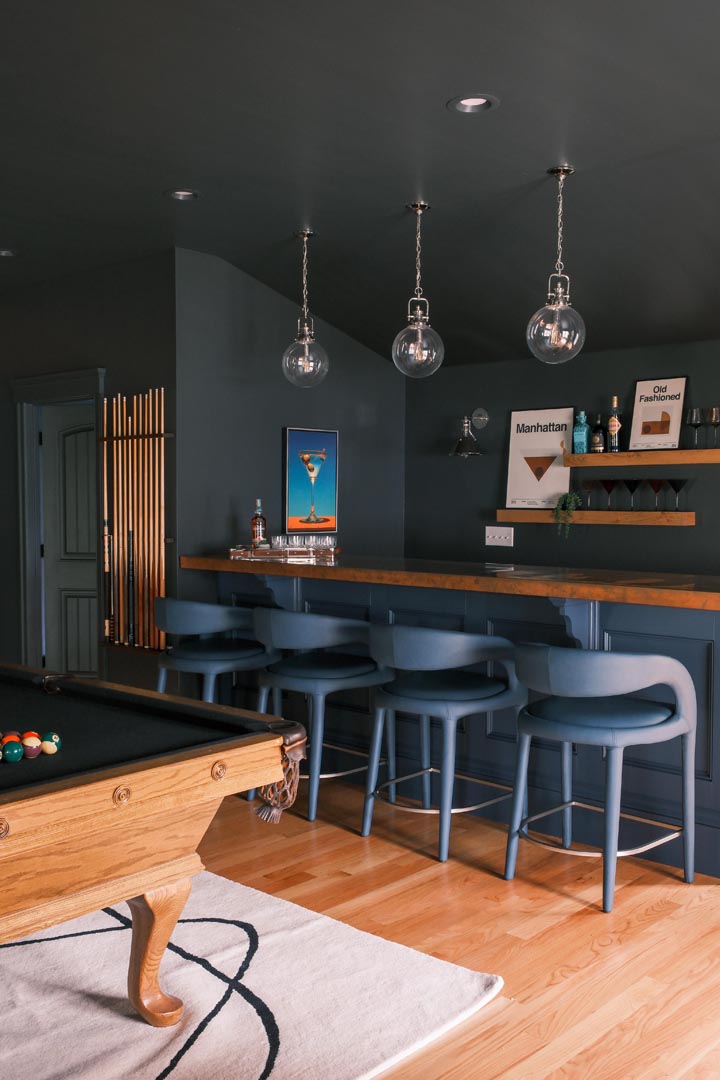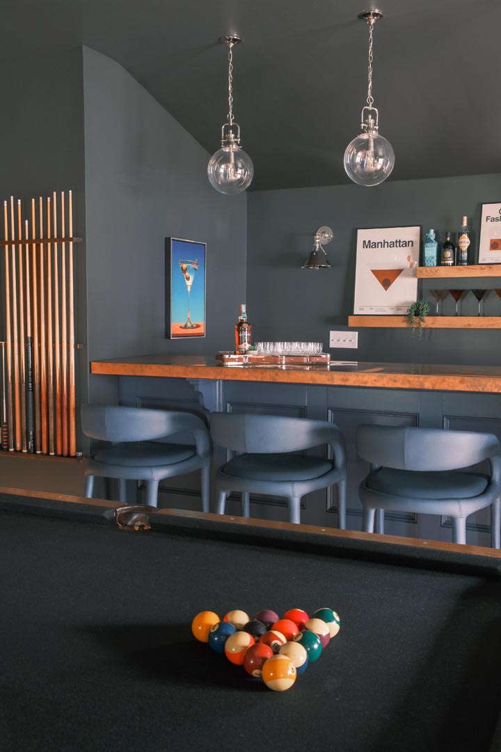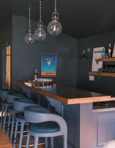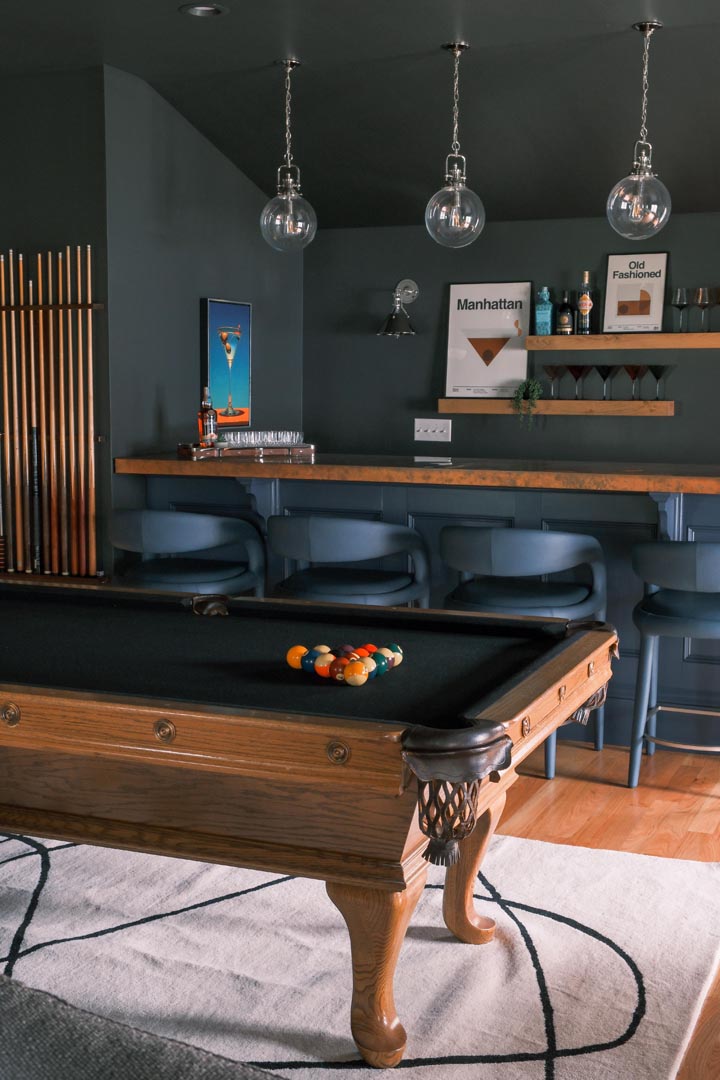 This family home in Windham, NH transformed from a simple, rustic bar setup into a modern game room designed for all ages. With moody gray tones, chrome accents, and a custom bar, the space now feels sleek, refined, and inviting. Featuring a pool table, TV, and cork dart wall, it’s the perfect spot for entertaining and relaxing together.