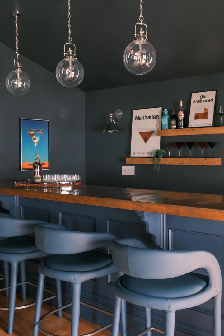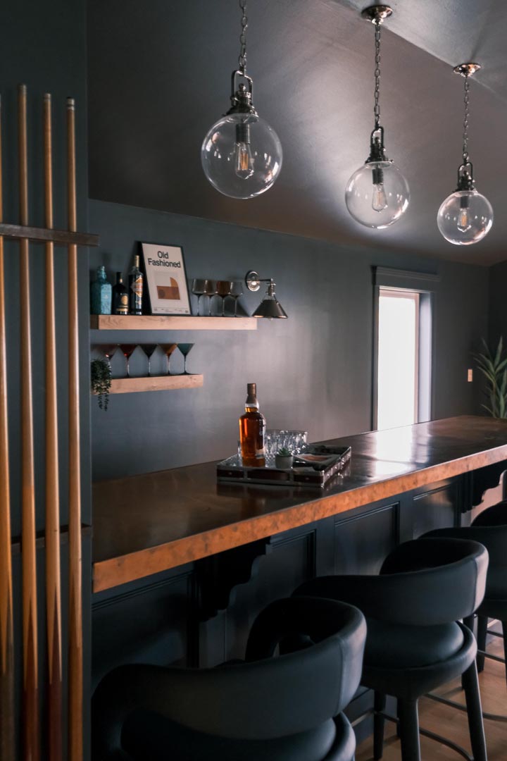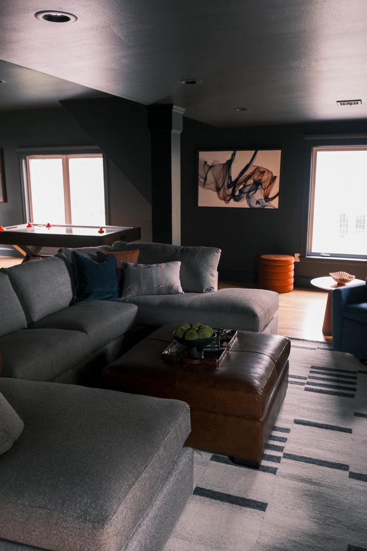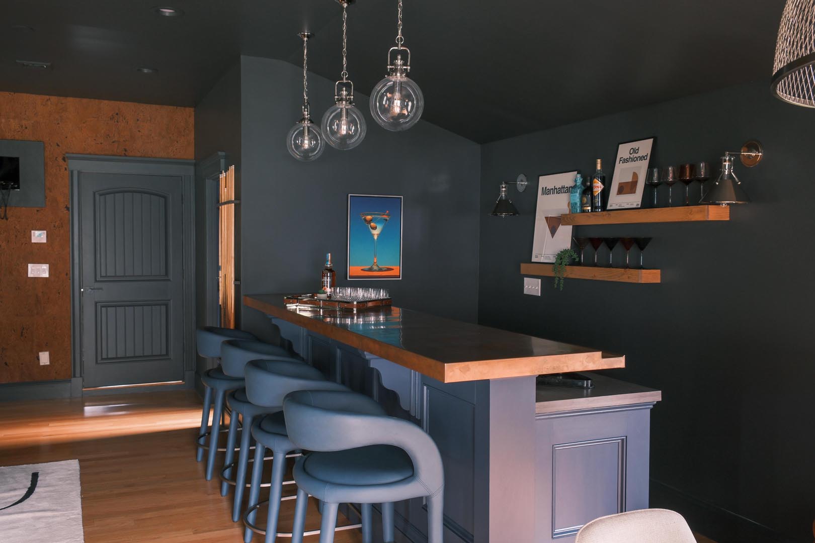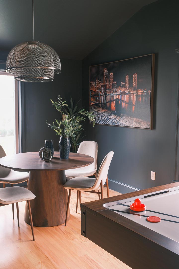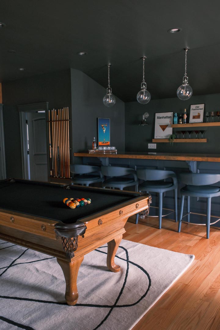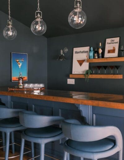 This family home in Windham, NH transformed from a simple, rustic bar setup into a modern game room designed for all ages. With moody gray tones, chrome accents, and a custom bar, the space now feels sleek, refined, and inviting. Featuring a pool table, TV, and cork dart wall, it’s the perfect spot for entertaining and relaxing together.