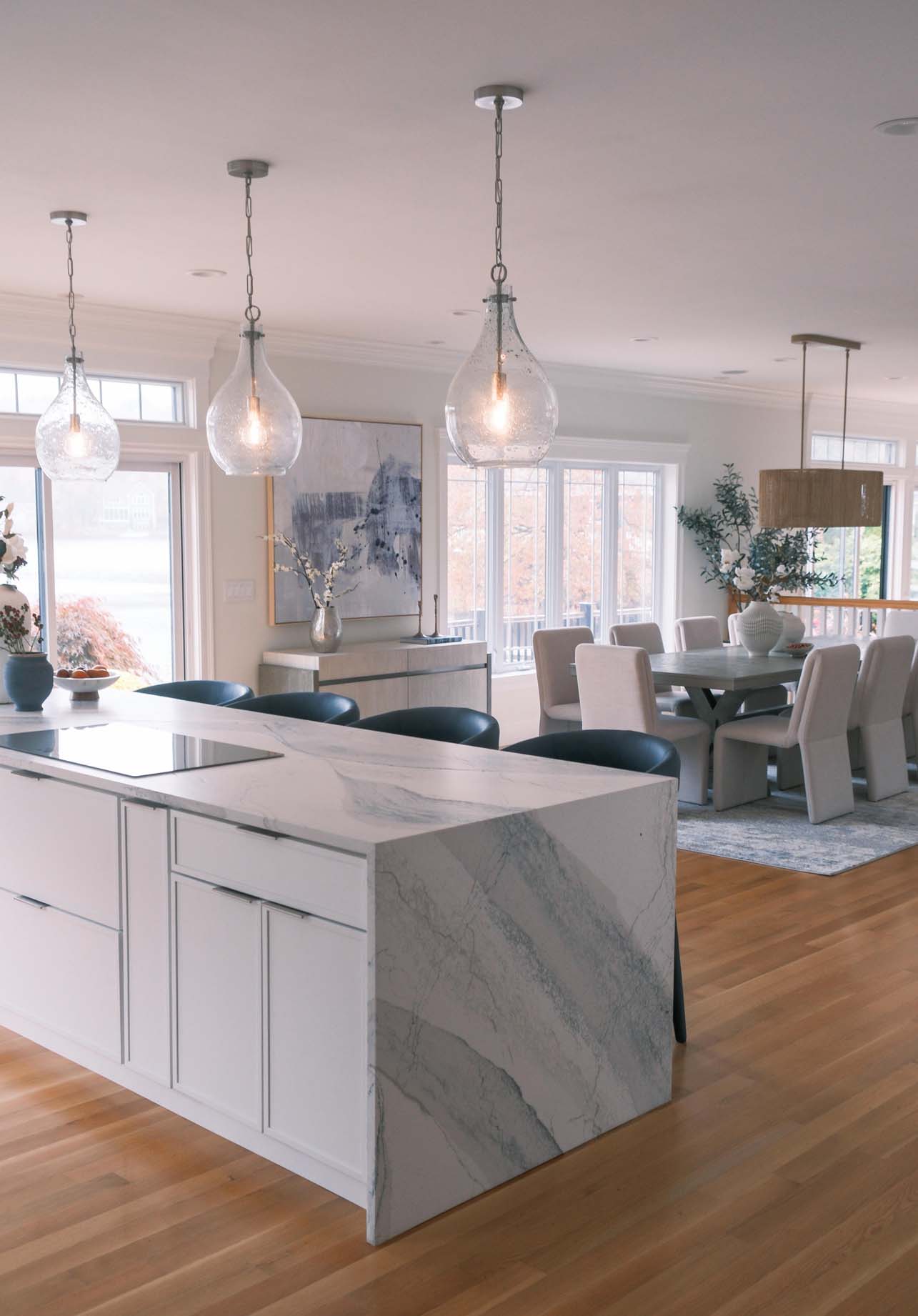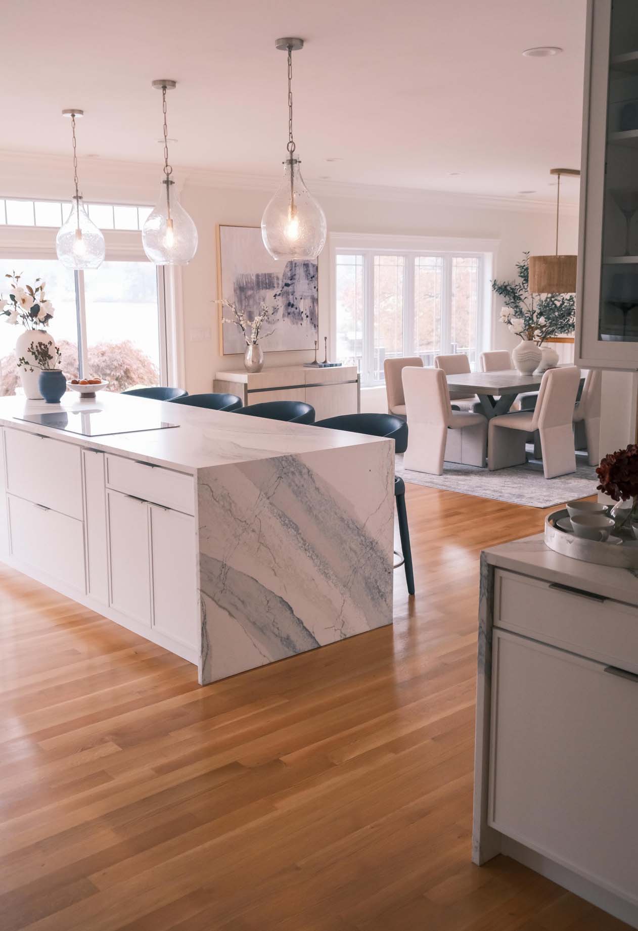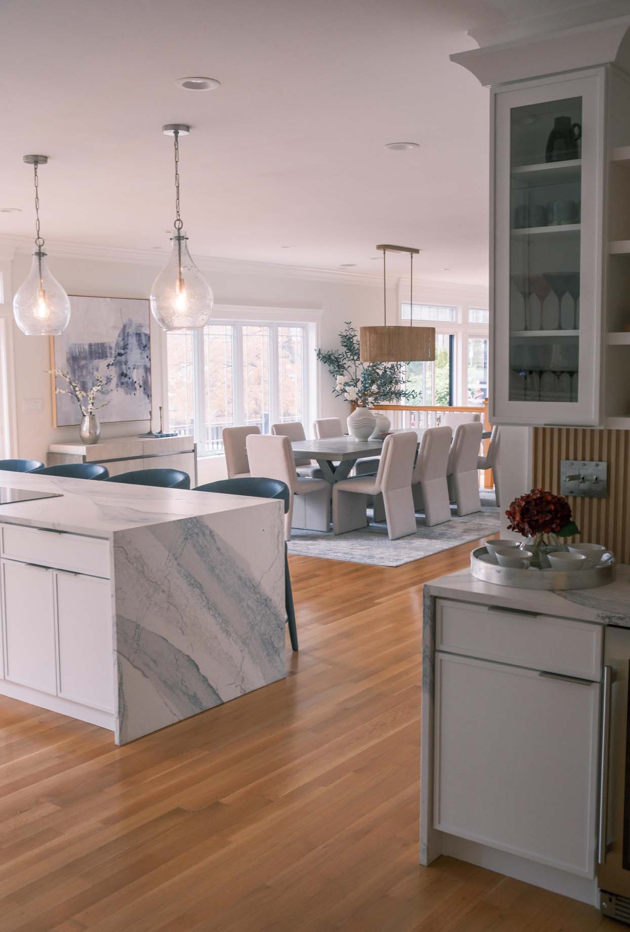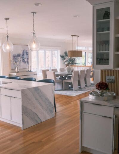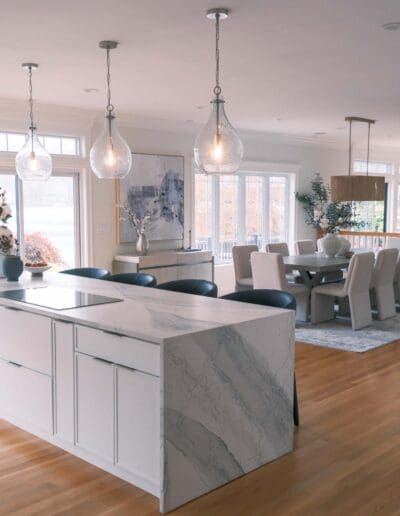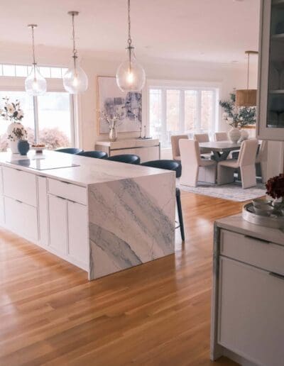 Embracing serene soft blues and rich wood finishes, this design seamlessly blends modern cottage charm with contemporary elegance in this home project in Billerica, MA. The unique island waterfall marble centerpiece stands out as a stunning focal point. Complemented by a modern round sofa, the space achieves a soft, cozy, and elevated ambiance that remains relaxed and inviting.
