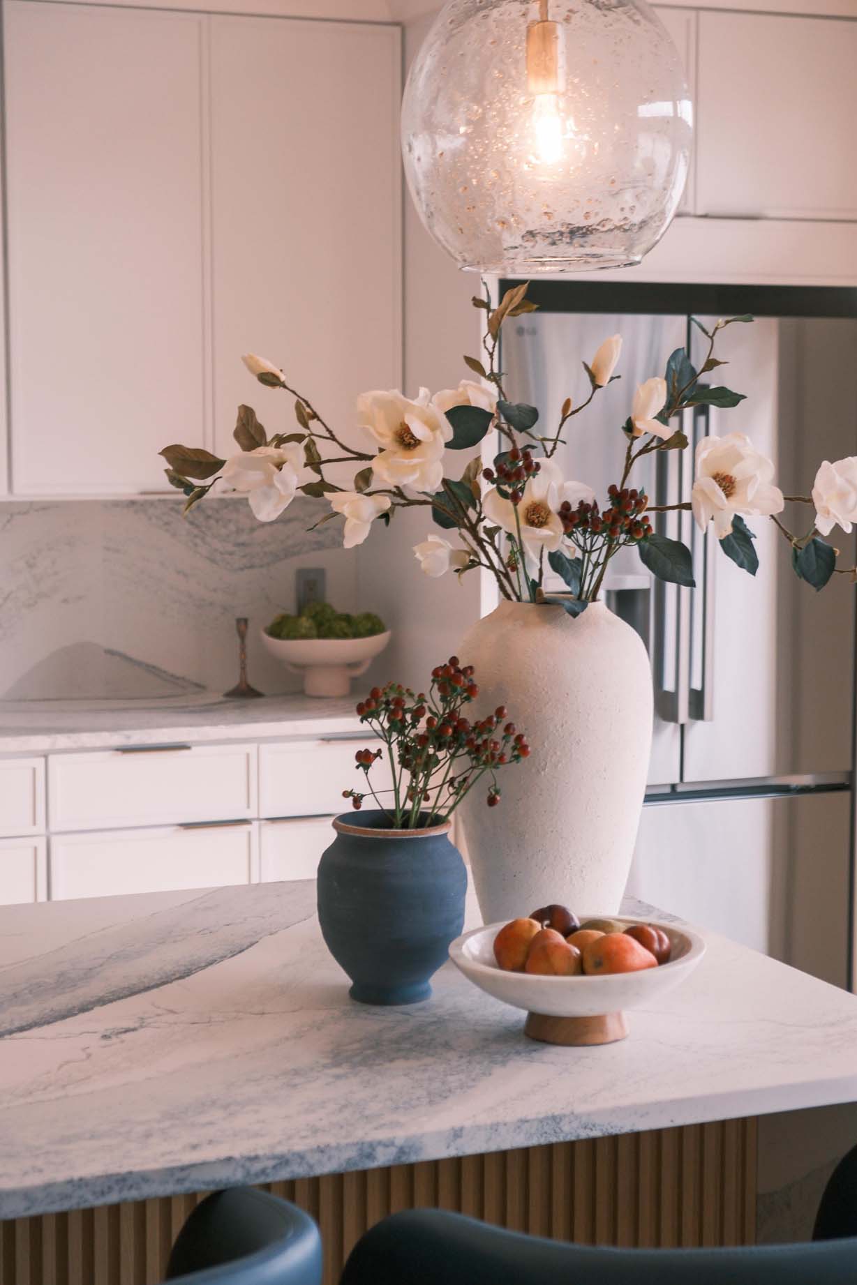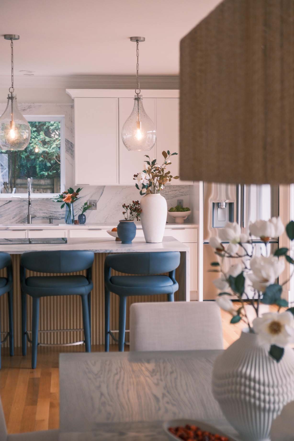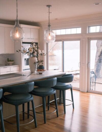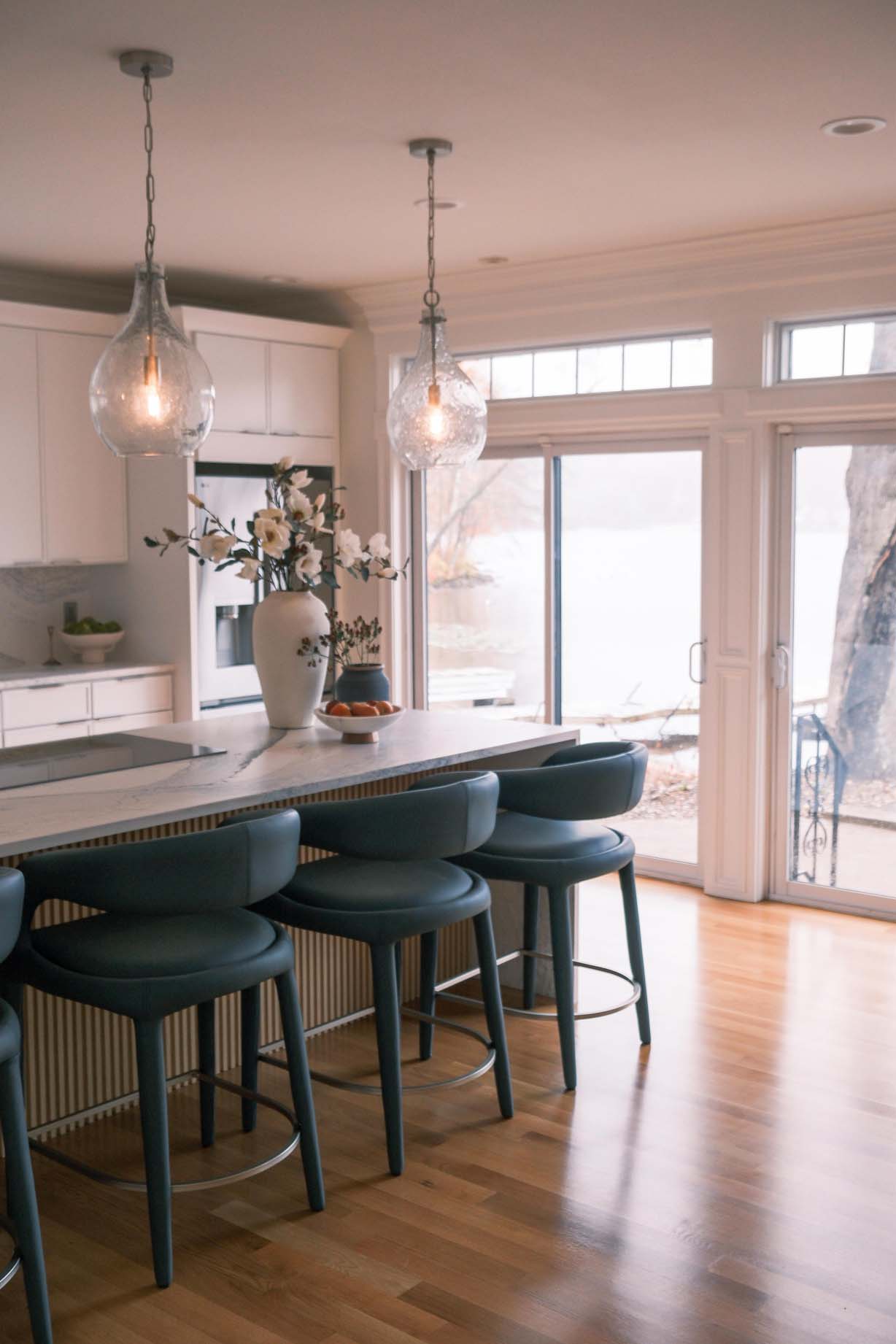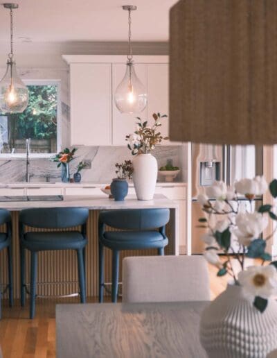 Embracing serene soft blues and rich wood finishes, this design seamlessly blends modern cottage charm with contemporary elegance in this home project in Billerica, MA. The unique island waterfall marble centerpiece stands out as a stunning focal point. Complemented by a modern round sofa, the space achieves a soft, cozy, and elevated ambiance that remains relaxed and inviting.