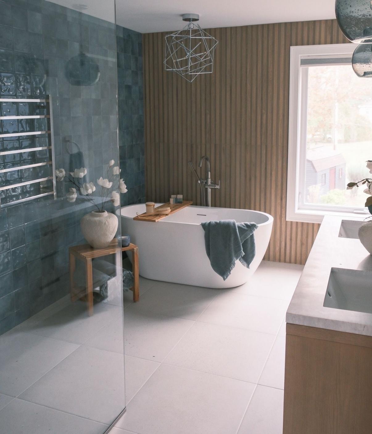 The adjoining master bathroom remodel delivers spa-like luxury with modern tilework, a freestanding soaking tub, and an open, light-filled shower. Updated finishes and a cleaner layout improved both aesthetics and functionality, creating a serene space to unwind after long days on the lake.