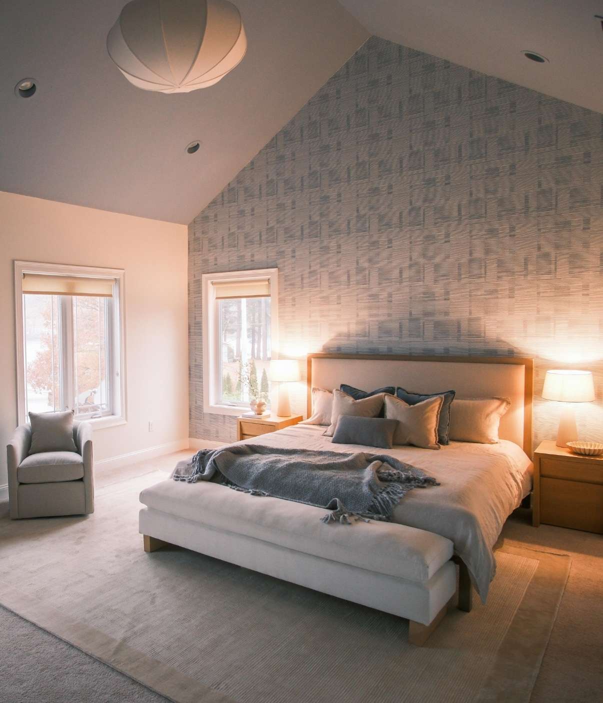 The primary suite was transformed into a calming retreat that reflects the peaceful setting of this Windham lake house. The master bedroom remodel features soft neutral tones, layered textures, and a custom accent wall that adds warmth and dimension to the vaulted ceiling.