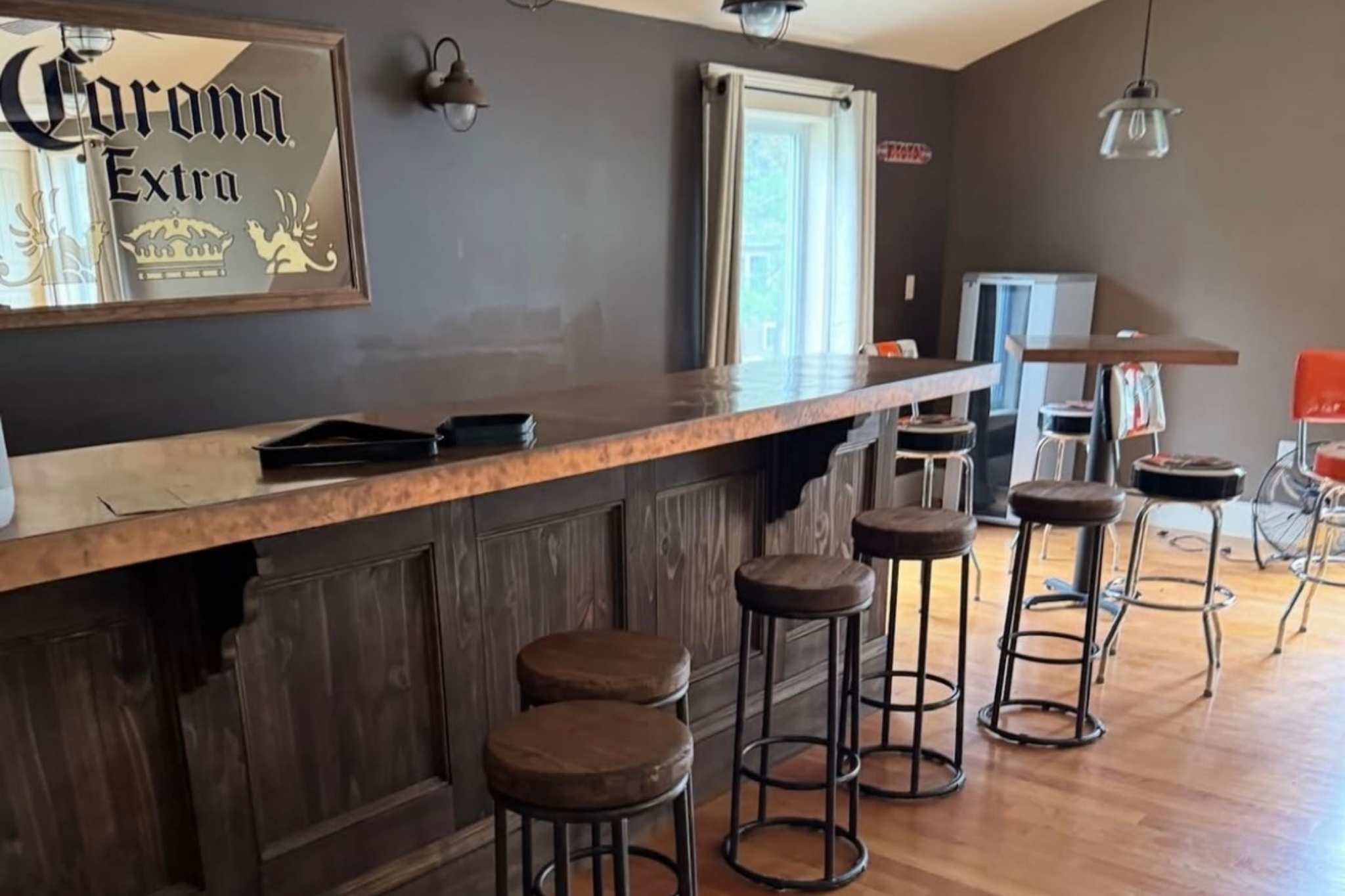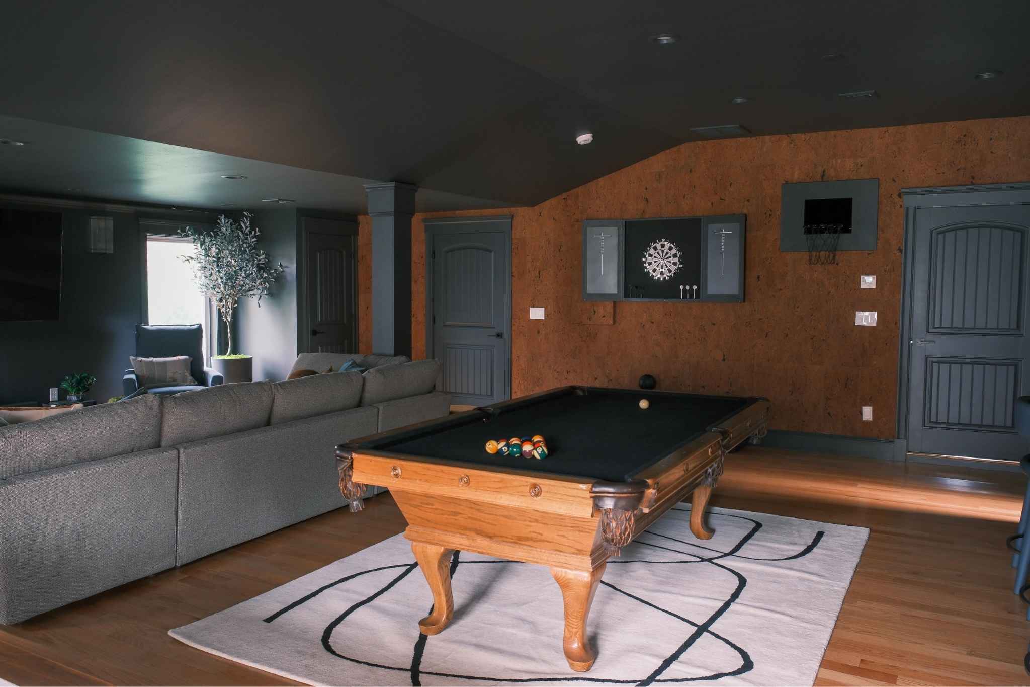 Designed for year-round enjoyment, the game room remodel transformed a simple rustic bar into a sleek, modern entertainment space. Moody gray tones, chrome accents, and a custom bar bring a refined feel, while features like a pool table, TV, and cork dart wall make it a favorite gathering spot for family and friends.